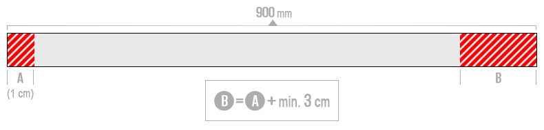 A teljes hossz (900mm) bal szélén és jobb szélén - 3cm különbséggel (2-5cm vagy 3-6cm) – helyet kell hagyni a varrásnak, ide grafika ne kerüljön.